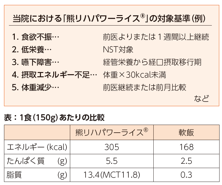 日本人にとって米飯は主食であり、高齢で食事摂取量の低下 した患者さんであっても、主食に関しては他の食材に比べて多 く摂取する印象があります。そこで、当院では低栄養の患者さ んや経口摂取量が乏しい患者さんに対する食事強化の一環とし て、2012 年より「熊リハパワーライスⓇ」を提供しています。 「熊リハパワーライスⓇ」とは、軟飯(二度炊き)のライスにMCT オイルおよびMCTパウダー、たんぱく質のパウダーを混ぜてエ ネルギー密度を高めたものです。1食分のエネルギー量を通常の 軟飯と比較すると、 「熊リハパワーライスⓇ」では約1.8倍のエネ ルギー増となります。
