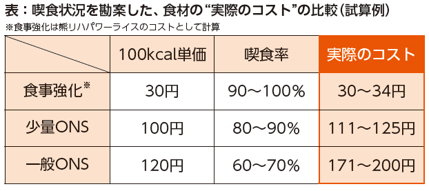たとえ100kcal単価が安価な食材であっても、患 者さんの喫食率が低ければ、他の食材よりもかえっ て割高になってしまう可能性があります。 右の表は患者さんの喫食状況を勘案した、食材の “実際のコスト”の試算例です。「熊リハパワーライ ス®」等の食事強化メニューは他の食材と比較して、 100kcal単価だけでなく実際のコストも安価である ことが分かります。