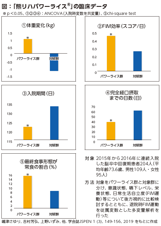 「熊リハパワーライス®」の大きな利点として、主食のボリュー ムを変えることなくエネルギーアップできること、ライスに混 ぜるだけで誰でも簡単に手早く調理できること等があります。 また、 「熊リハパワーライス®」に利用しているMCTは、消化 吸収が早く、速やかにエネルギーとして利用されるという特性 があり、消化吸収能が低下した患者さんに対しても使いやすい と考えます。加えて、MCTは油脂のため、血糖値の急激な変動 を抑える働きがあります。このため、耐糖能の低下した高齢の 患者さん等にも使用しています。 さらに、MCTオイルは無味無臭であり、食事の風味や食感に 影響を与えないため、普段の食事の中で無理なく継続摂取でき るほか、患者さんの嗜好に合わせて味の工夫や調整を行いやす いといったメリットもあります。 当院の回復期病棟に連続入院した204人の脳卒中患者さんの データを用いた後ろ向きコホート研究では、「熊リハパワーラ イス®」を提供することで体重の増加、ADL(Activities of Daily Living)の改善、入院期間の短縮、経口摂取までの日数の短縮、完 全経口摂取までの日数、最終形態が常食の割合の増加等に関し て改善効果が示されています。 こうしたデータを踏まえ、当院では「熊リハパワーライス®」の 他にも、MCTを使用した食事強化メニューを提供しています。例 えば、アイスクリームにMCTを加えてシェイクにした「熊リハ パワーシェイク」は、1日2食しか食べない方や食事自体を食べよ うとしない方のエネルギー・たんぱく質の確保に役立っています。