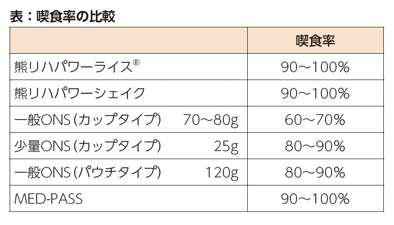せっかく栄養処方をしても、患者さんが実際に食べていただ けなければ意味がありません。当院スタッフへのアンケート調 査によると、食事強化メニューである「熊リハパワーライス®」 や「熊リハパワーシェイク」などの喫食率は90~100%と非常 に高い一方で、ONSの喫食率は60~90%とやや低めでした。 喫食率が向上すると、栄養士の皆さんが提供している栄養価と の乖離を減らすだけでなく、患者さんに「食べきれた」という自 信が生まれることにもつながります。もしONSを使用する際に は、患者さんの喫食率を考慮し、食べきりやすい少量タイプの ONSを選択する方法もよいでしょう。