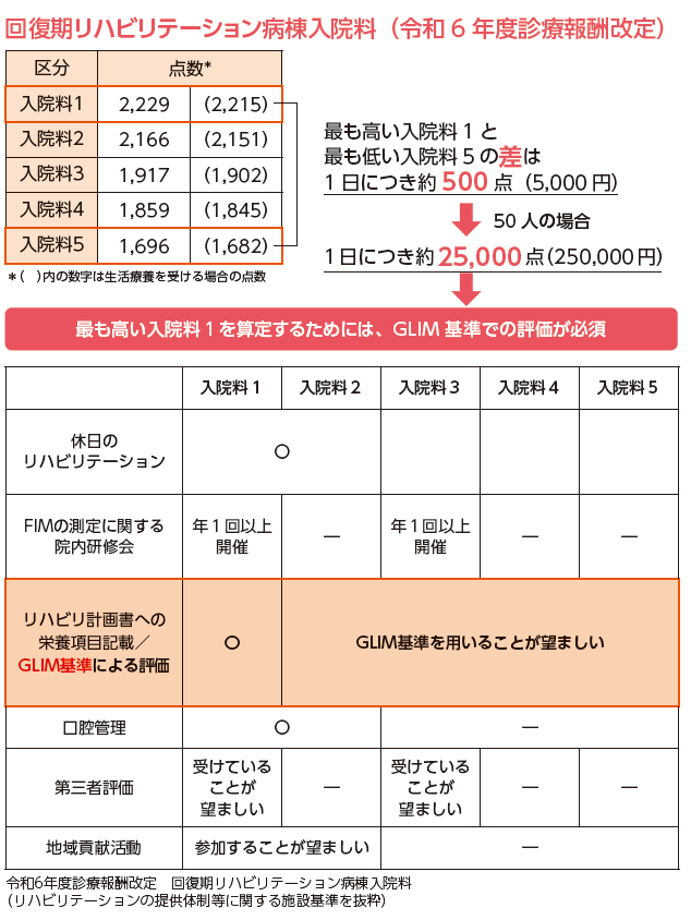 令和6年度診療報酬改定に伴う制度的な後押しを 一つの契機として、近年、栄養サポートが回復期リ ハビリテーション病棟の収益に直結する戦略的要素 となり得ることが認知されつつあります。 右上の表は「回復期リハビリテーション病棟入院 料1~5」の点数を示したもので、最も高い入院料1と 最も低い入院料5では1日につき約500点(5,000円) の差があることが分かります。 入院料1を算定するためには、GLIM基準による栄 養評価が必須であり(右下の表を参照)、施設によっ ては管理栄養士の配置の調整や教育・研修活動等の 初期対応が必要になるかもしれません。 しかし、適切な栄養サポートが合併症リスクの低 下やADLの改善を通じて、病棟の回転率や施設の運 営効率に好影響を及ぼす可能性を含めて考えれば、 初期対応に伴う負担を上回るメリットが期待できる のではないかと考えます。