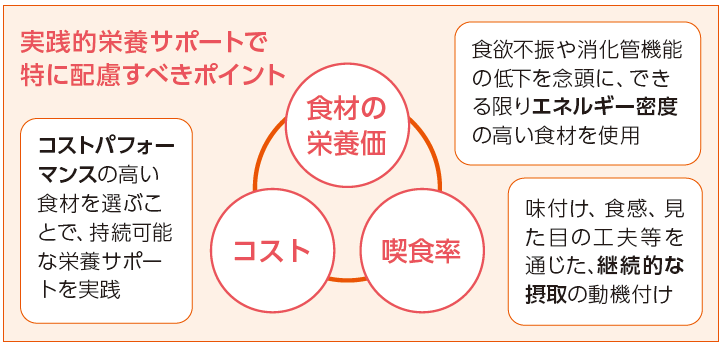 食事強化メニューやONSが高栄養価であっても、そのコスト が高い場合には経済的負担が重くなり、継続的な提供が困難に なる可能性があります。限られた予算の中で栄養サポートの効 果をできる限り高めるためには、常日頃からコストパフォーマ ンスに配慮することが求められます。 特に長期的な提供が必要な食材の場合、よりコストパフォー マンスの高い食材を選択することが、持続可能な栄養サポート の実現に繋がります。